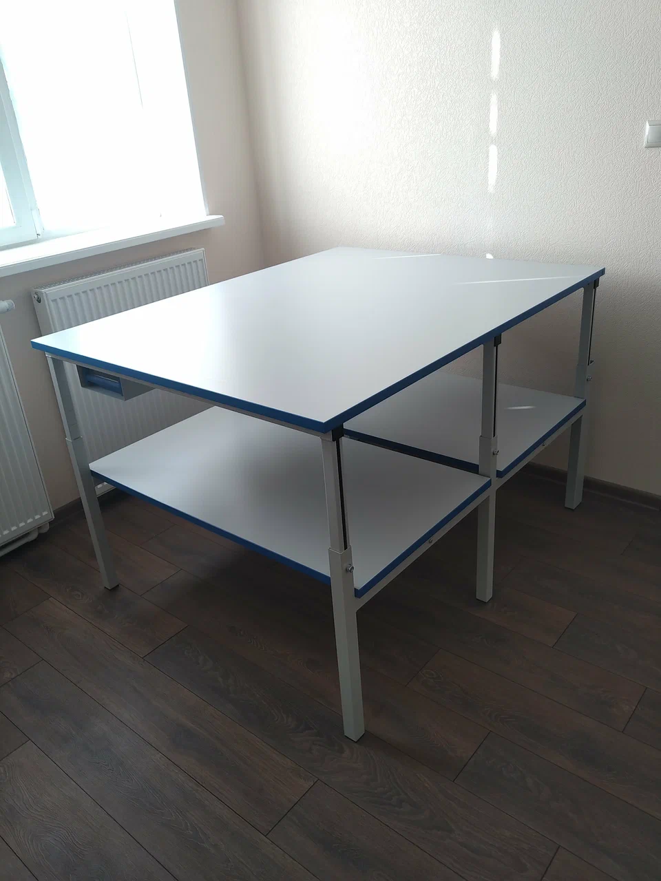 Для хранения и размещения рулонных материалов предусмотрена нижняя полка во всю ширину стола. Раскройный стол СР легко выдерживает нагрузку в 300 кг. Конструкция стола СР имеет регулировку высоты столешницы 650-950 мм., что позволяет установить её на любую удобную Вам высоту, а в последствии , если это необходимо, легко поменять. Столешница и полка изготовлены из ЛДСП толщиной 25 мм. Все рабочие места Gresson серии СР могут быть оборудованы регулируемыми опорами, что позволит нивелировать неровность пола и при необходимости увеличить высоту стола.