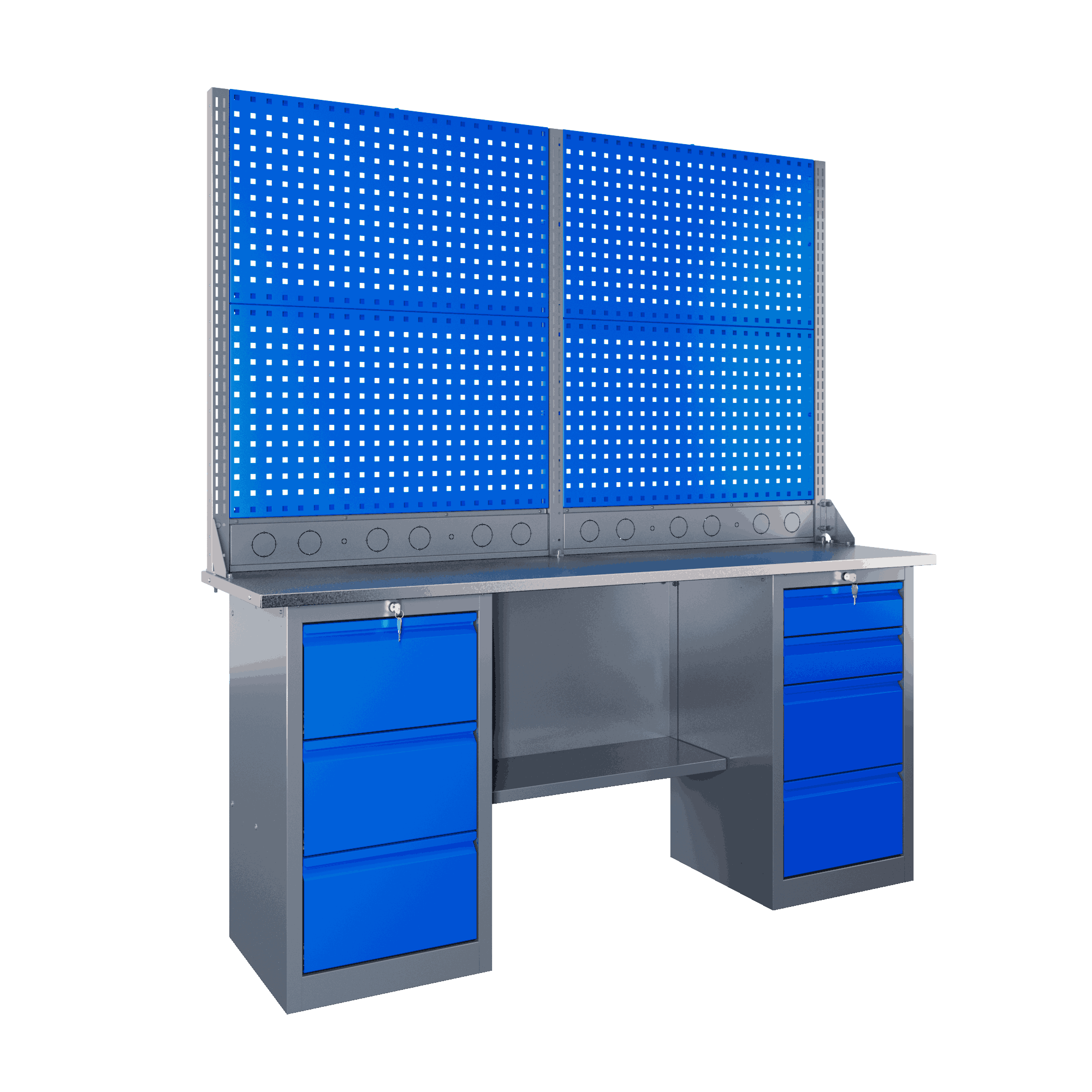 Самые компактные верстаки с глубиной столешницы 500 мм. Благодаря небольшой глубине, такие верстаки легко размещаются в ограниченных пространствах, например, в гаражах, мастерских и тд. Несмотря на компактные размеры, верстаки могут быть оснащены полками, ящиками и держателями для инструментов, что помогает поддерживать порядок и быстро находить нужные предметы.